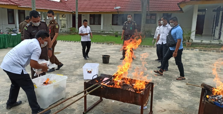 PANGKALAN KERINCI (MR) - Kejaksaan Negeri (Kejari) Pelalawan, menggelar pemusnahan barang bukti (BB) yang telah berkekuatan hukum tetap (Inkracht) bertempat di halaman belakang Kantor Kejari Pelalawan, Pangkalan Kerinci.