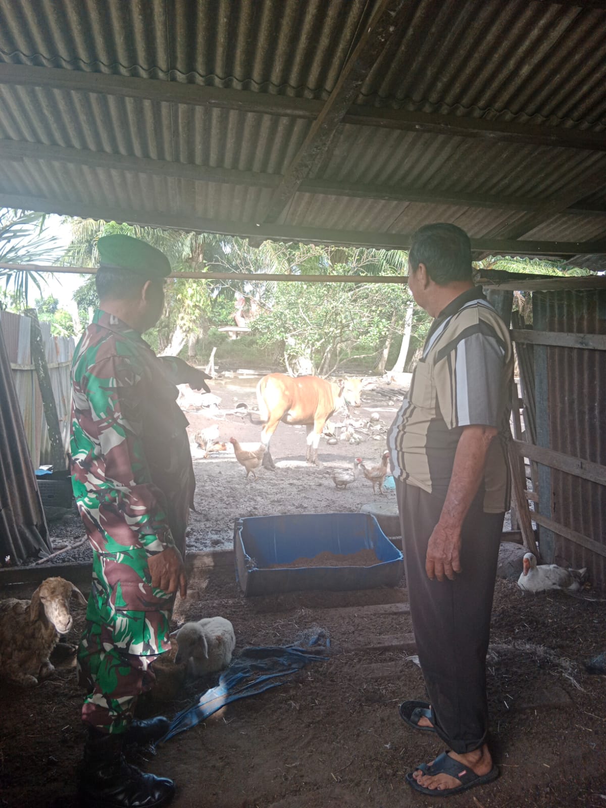 DUMAI (MR) - Babinsa Kelurahan Purnama Sertu Mahyudin melaksanakan pemantauan serta sosialisasi wabah PMK ( Penyakit Mulut dan Kuku) pada hewan ternak milik warga binaan, (15/11).