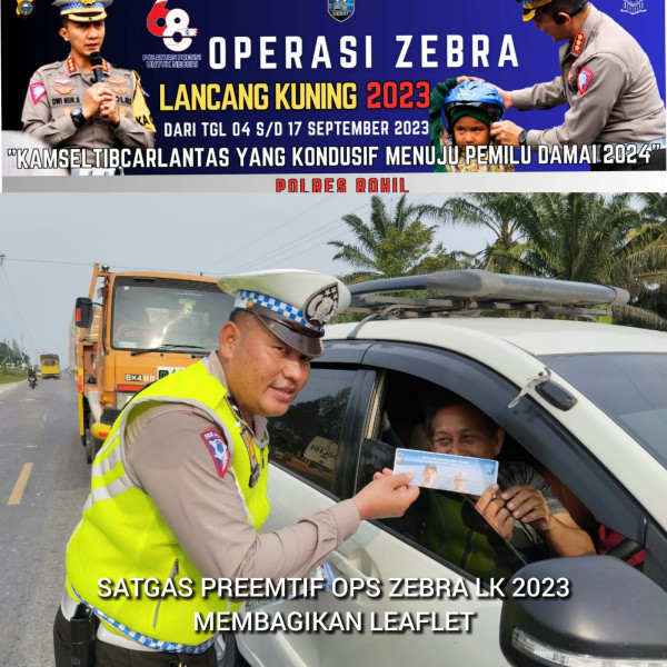 Dalam melaksanakan Operasi Zebra Lancang Kuning Tahun 2023 hari ke 3, Satgas Preemtif Ops Zebra LK 2023 melaksanakan pembagian 200 Leaflet Ops Zebra LK 2023 kepada pengendara roda 2 dan roda 4 baik angkutan umum maupun barang.