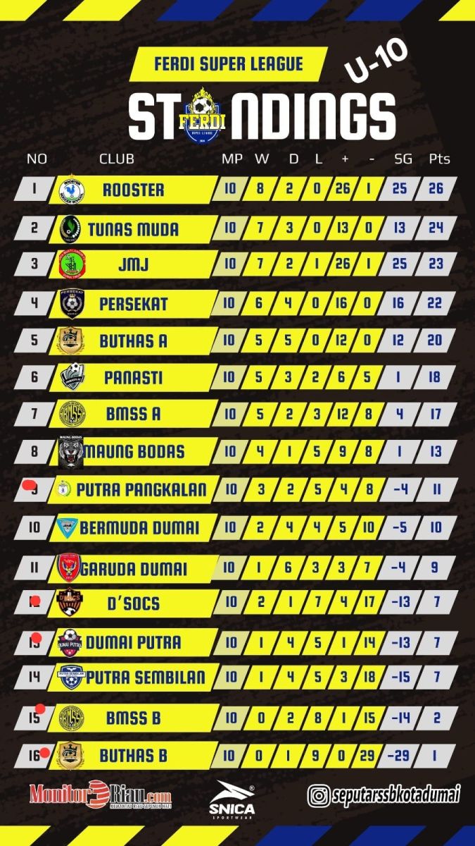 Lanjutan Ferdi Super League U-10 & U-12 akan dilaksanakan Minggu 22 September 2024, di Lapangan Sepakbola Purnama Dumai. ***
