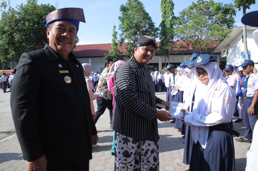 ASAHAN (MR) - Menggunakan Tanjak Melayu Bupati Asahan, Taufik Zainal Abidin, S.Sos., M.Si pimpin peringatan Hari Pendidikan Nasional (Hardiknas) di Kabupaten Asahan yang bertempat di halaman Sekolah SMP Negeri 2 Kisaran pada Jumat, 02/05/2025.