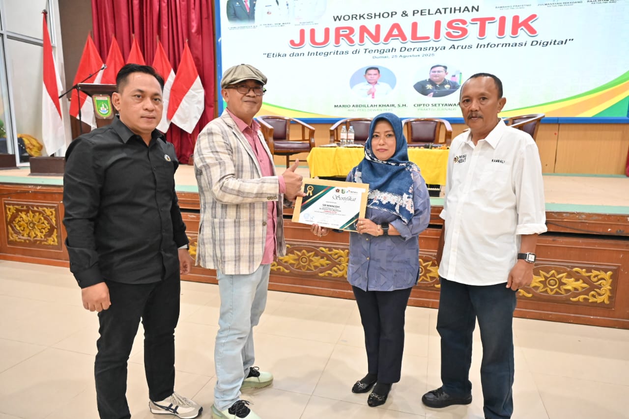 DUMAI (MR) – Persatuan Wartawan Indonesia (PWI) Kota Dumai menggelar Workshop dan Pelatihan Jurnalistik bertajuk "Etika dan Integritas di Tengah Derasnya Arus Informasi Digital" pada Senin (25/8/2025), bertempat di Balai Sri Bunga Tanjung. Acara ini dibuka secara resmi oleh Wakil Wali Kota Dumai, Sugiyarto, dan diikuti oleh 60 peserta yang merupakan wartawan dari berbagai organisasi pers di Dumai.