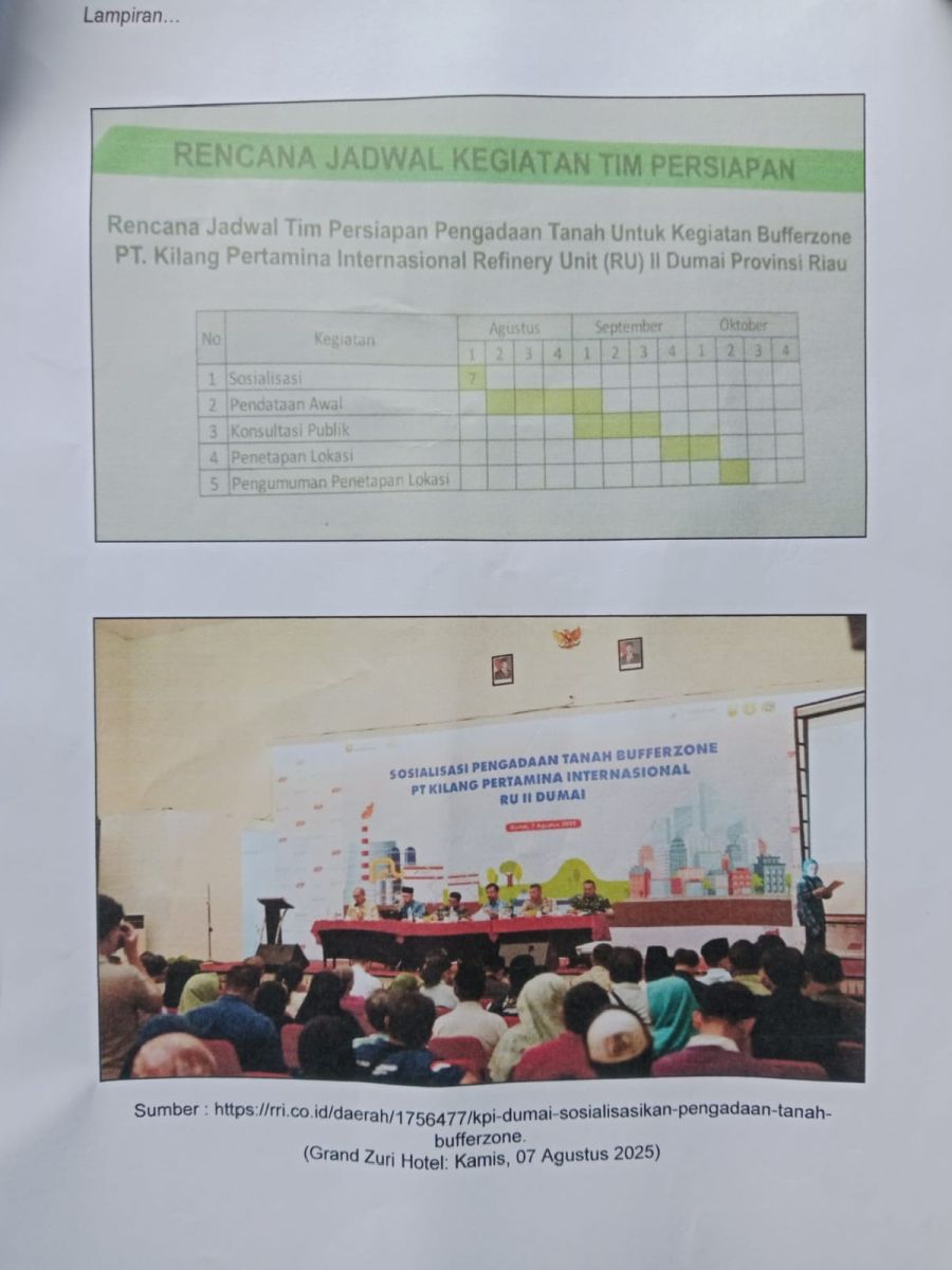Selain itu, masyarakat juga meminta penjelasan terkait surat dari SKK Migas mengenai keberadaan lahan BMN tanah Hulu Migas Dumai seluas kurang lebih 0,5 hektare yang masuk dalam rencana penggunaan lahan oleh PT KPI RU II Dumai.