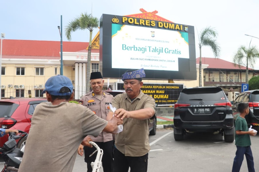 DUMAI (MR) - Polres Dumai melaksanakan kegiatan pembagian takjil Ramadhan 1447 H/2026 M kepada masyarakat pengguna jalan menjelang waktu berbuka puasa. Kegiatan yang bertempat di depan Markas Kepolisian Resor (Mako) Polres Dumai, Jalan Jenderal Sudirman Kelurahan Buluh Kasap Kecamatan Dumai Timur, berlangsung pada hari Jumat (27/2/2026) sekitar pukul 17.00 WIB hingga pukul 18.00 WIB.