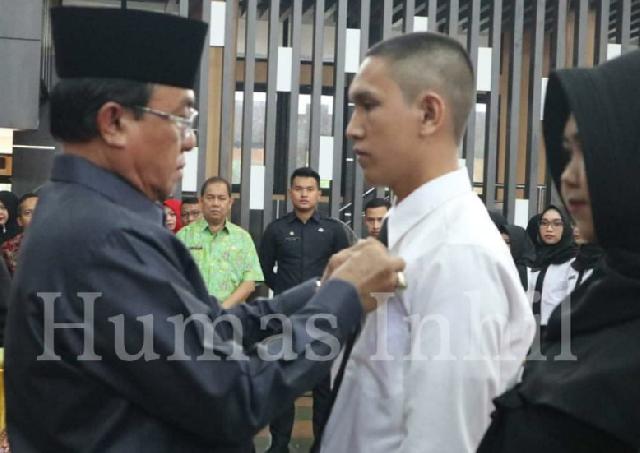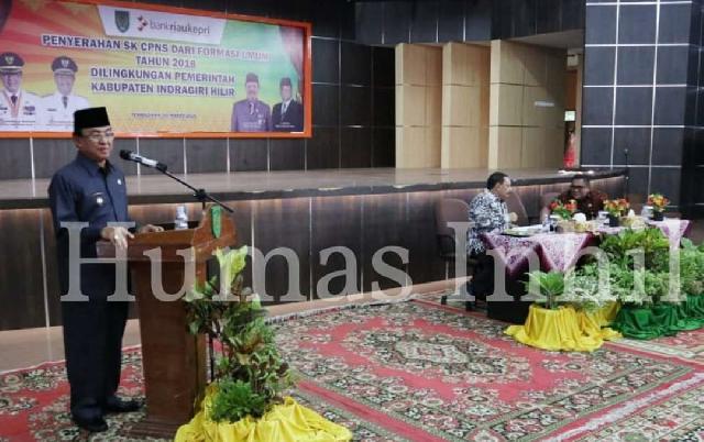 TEMBILAHAN (MR) - Bupati Kabupaten Inhil, HM Wardan menyerahkan Surat Keputusan Calon Pegawai Negeri Sipil (SK CPNS) kepada 329 orang CPNS yang dinyatakan lulus seluruh tahapan tes dari Formasi Umum tahun 2018 silam, Jum'at (1/2/2019) di gedung Engku Kelana, Tembilahan.
