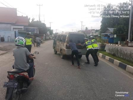TELUKKUANTAN (MR) - Tiga Anggota Satlantas Polres Kuansing, menuai pujian dari masyarakat, setelah aksinya tertangkap kamera mendorong mobil mogok di jalan lintas Provinsi Telukkuantan, Kecamatan Kuantan Tengah, Kuansing, Jum'at (28/12/2018) tadi siang.