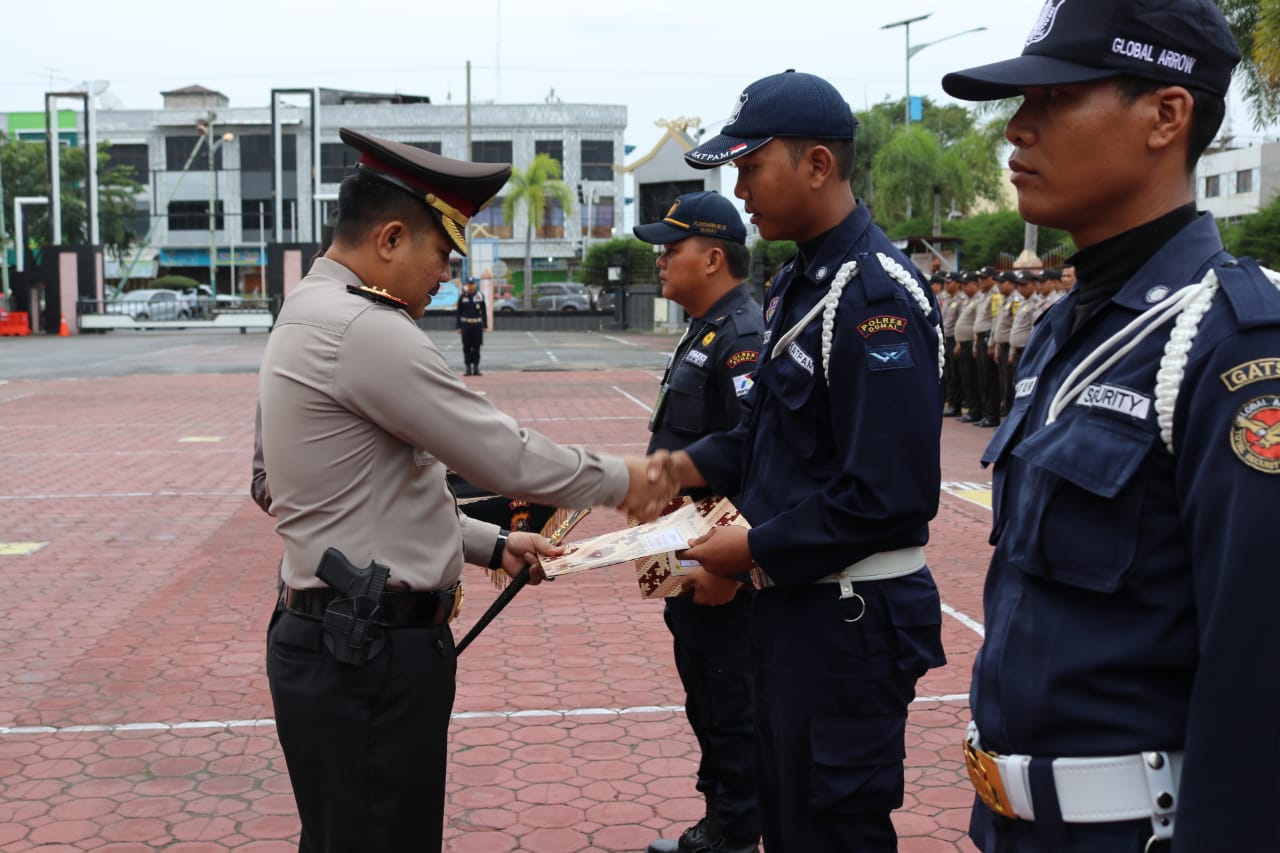 DUMAI (MR) - Sebanyak 19 Satuan Pengamanan (Satpam) berprestasi mendapatkan Penghargaan dari Kepala Kepolisian Resort (Kapolres) Kota Dumai, Ajun Komisaris Besar Polisi (AKBP) Restika P. Nainggolan sempena HUT Satpam ke 38 Tahun 2018.
