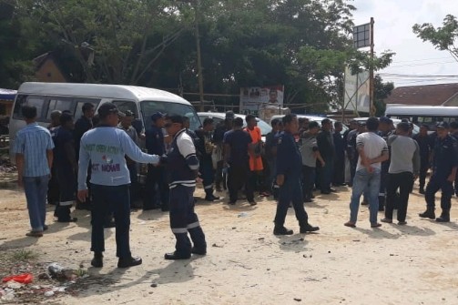 DURI (MR) - Guna memperjelas status dan haknya, ratusan tenaga Satuan pengamanan dibawah naungan PT Delta Metro Guard (DMG) di Kota Duri, Kecamatan Mandau, Bengkalis, Selasa (15/1/19) pagi menggelar aksi mogok kerja dilapangan Pasar Lambung, Jalan Rangau, Kelurahan Pematang Pudu.