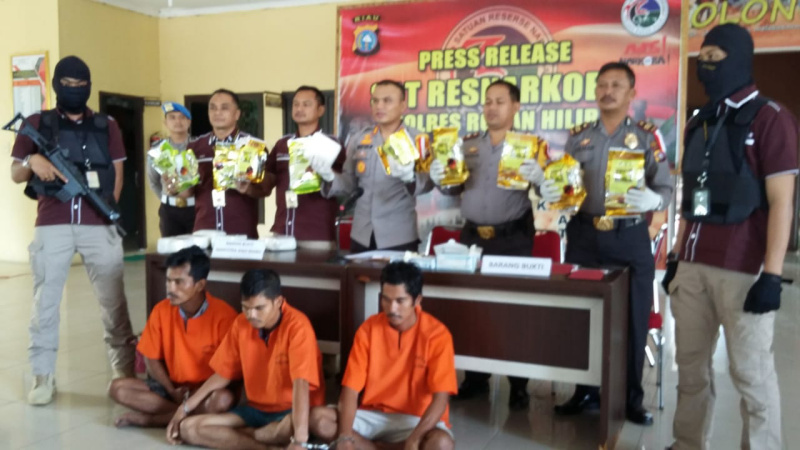 Press rilis ini di pimpin langsung Kapolres Rokan Hilir AKBP Sigit Adiwurianto SIK MH di dampingi Waka Polres Kompol dr Wawan SH,Kapolsek Pasir Limau Kapas Iptu Zulmar,Kasat Narkoba AKP Herman Pelani SH,Kabag Humas AKP Juliandi dan jajaran Personil Polres Rohil serta menghadirkan 3 tersangka As,Jm,Rh serta barang bukti.