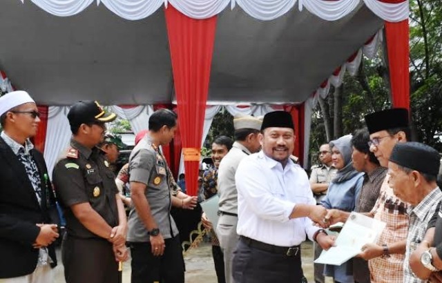 Penyerahan sertifikat ini dilakukan pada acara penyerahan sertifikat tanah untuk rakyat Program Pendaftaran Tanah Sistematis Lengkap (PTSL).