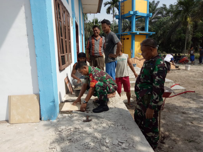 Babinsa Tanjung Penyembal Bantu Pasang Keramik di Musholla Al Muhajirin