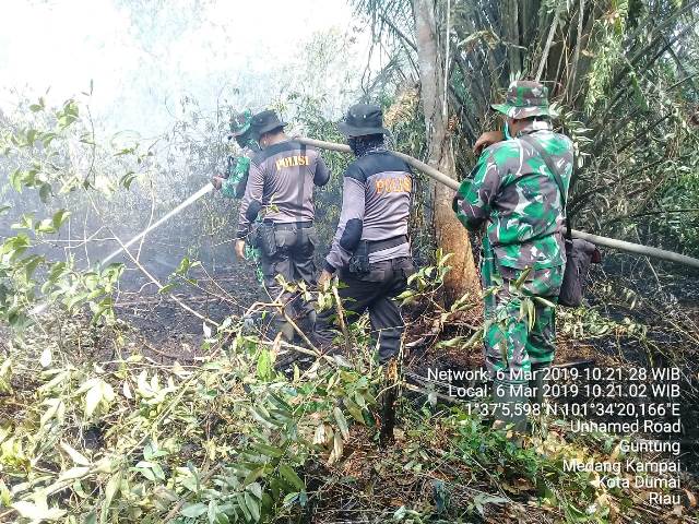 DUMAI (MR) - Satgas Pemadaman Kebakaran Hutan dan Lahan (Karhutla) Dumai, Rabu (6/3/2019), Kembali melakukan pemadaman di kawasan Jalan Sri Lestari Kelurahan Guntung Kecamatan Medang Kampai.