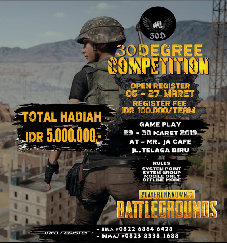 TEMBILAHAN (MR) - 30Degree menggelar turnamen Player Unknown’s Battlegrounds (PUBG) Mobile 2019 dengan nominal hadiah jutaan rupiah.