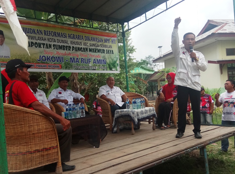 DUMAI (MR) - Mulyadi, Anggota DPRD Dumai yang kini maju lagi sebagai Calon Legislatif Kota Dumai dari PDI Perjuangan nomor urut 5 dari dapil Bukit Kapur-Sungai Sembilan menggelar kampanye dialogis dengan tema mewujudkan reformasi agraria di kawasan HPH-HPI, Kamis (28/03/2019) di kelurahan Tanjung Penyembal Kecamatan Sungai Sembilan.