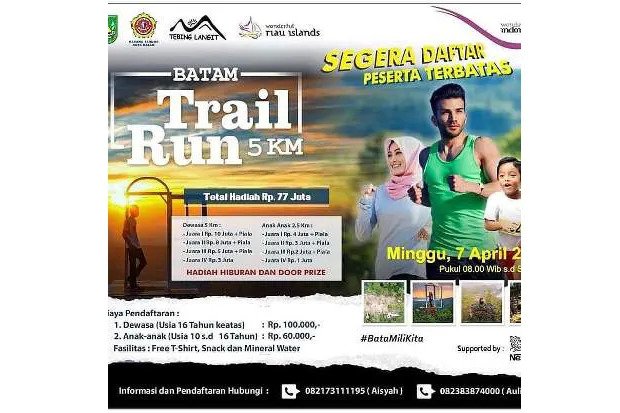 “Silahkan bergabung di Batam Trail Run 5K. Proses pendaftarannya sangat mudah. Para wisatawan yang sudah berada di Batam untuk liburan bisa segera mendaftar. Lombanya baru digelar Minggu (7/4) besok. Yang jelas, kemasan Batam Trail Run 5K ini sangat menarik,” kata Dessy.