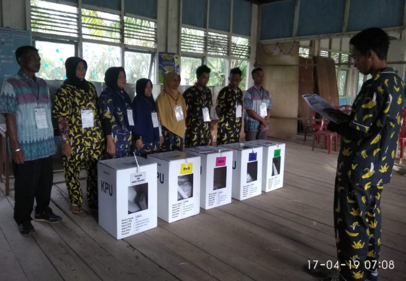 TEMBILAHAN (MR) - Petugas Kelompok Penyelenggara Pemungutan Suara (KPPS) di TPS 2 Desa Sialang Panjang Kecamatan Tembilahan Hulu Kabupaten Indragiri Hilir (Inhil) tampil unik saat berlangsungnya Pemilu 2019.