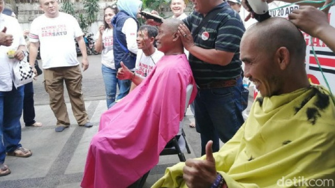 Pantauan detikcom di Posko ASJB, Jl Kemang Dalam X E9, Jakarta Selatan, Sabtu (20/4/2019), para relawan tampak antusias mengikuti selebrasi menggunduli kepala itu. Aksi ini diikuti sekitar 30 peserta.