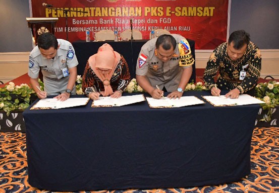 KEPRI (MR) - Bank Riau Kepri bersama Badan Pengelola Pajak dan Retribusi Daerah (BP2RD) Kepulauan Riau, Direktur Lalu Lintas Kepolisian Daerah Kepulauan Riau dan PT. Jasa Raharja (Persero) Kepulauan Riau melaksanakan MoU tentang layanan informasi dan pembayaran Pajak Kendaraan Bermotor (PKB) melalui aplikasi e-samsat Provinsi Kepulauan Riau.