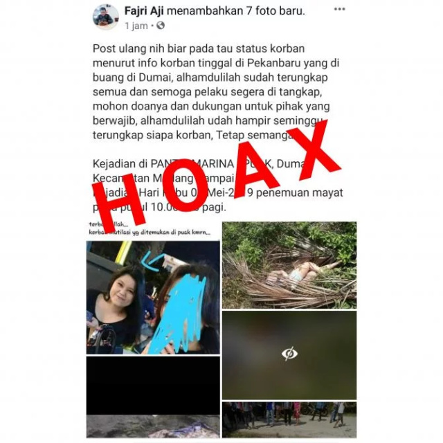 Dalam postingan tersebut menyebutkan bahwa telah ditemukan salah satu potongan tubuh mayat perempuan tanpa kepala yang ditemukan di Jalan Mattaim RT 04 Kelurahan Teluk Makmur, Kecamatan Medang Kampai, pada Kamis (2/5/2019) lalu.