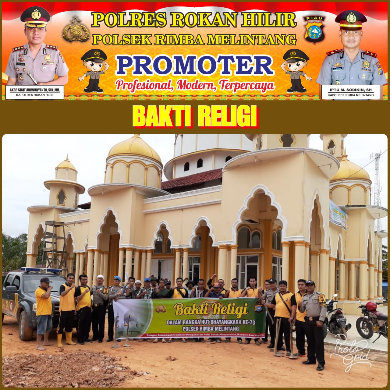 Kapolsek Rimba Melintang Iptu Muhammad Sodikin mengatakan giat bakti religi ini di lakukan dalam rangka memperingati HUT Bhayangkara ke-73 dengan cara membersihkan Masjid dan perkarangan Masjid Istiqomah, kemudian memberikan bantuan tanah timbun sebanyak 20 mobil Dump Truck untuk pekarangan Masjid dan Pembangunan MDTA Istiqomah dilanjutkan dengan Ikut melaksanakan giat penimbunan di pekarangan masjid Itiqomah."katanya.