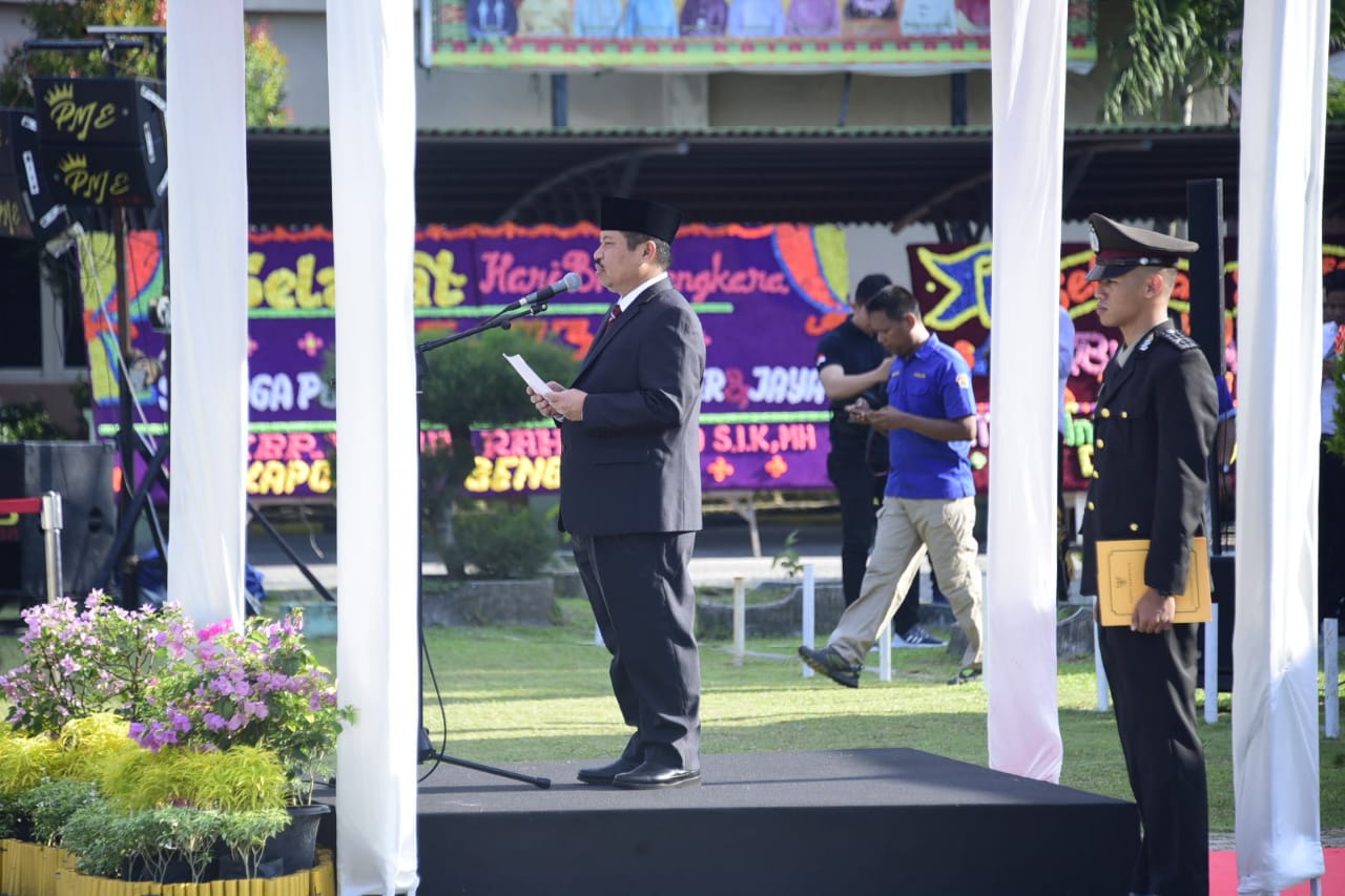 DURI (MR) - Bupati Bengkalis Amril Mukminin menjadi Inspektur Upacara sempena HUT-Bhayangkara ke-73 di halaman Kantor Camat Mandau, Rabu (10/7/19).