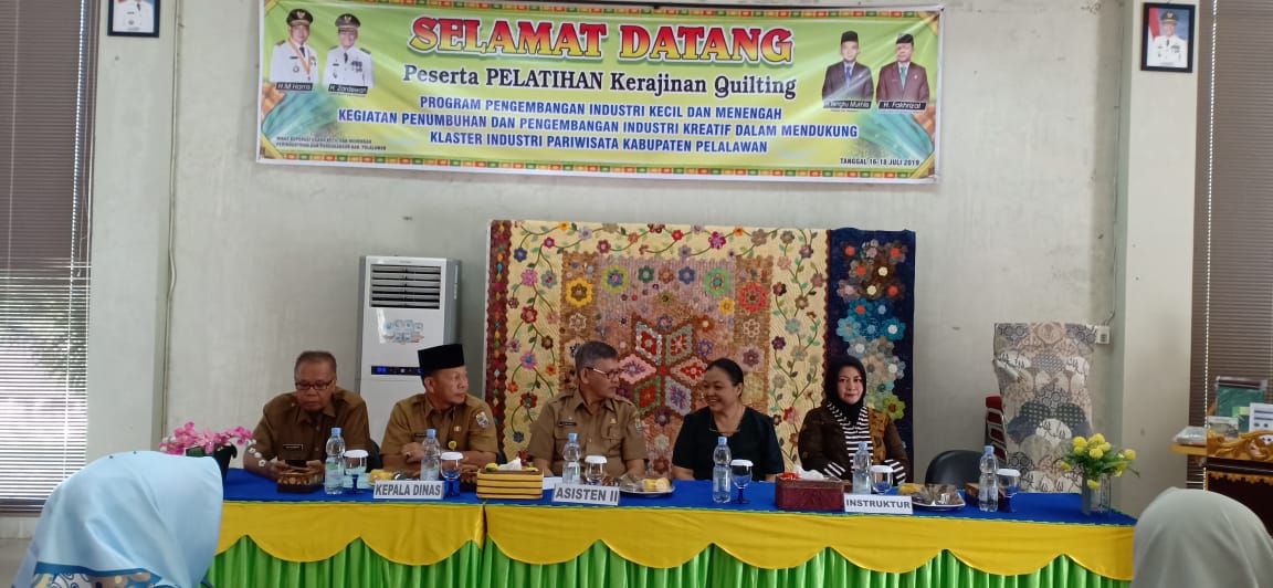 PANGKALANKERINCI (MR) - Dinas Perindustrian Perdagangan, Pasar Koperasi dan UMKM Kabupaten Pelalawan, Riau, melaksanakan kegiatan pelatihan kerajinan quilting, bertempat di gedung PLUT KUMKM, Pangkalan Kerinci, Selasa (16/07).