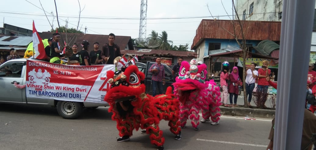 DURI (MR) - Pemerintah Kecamatan (Pemcam) Mandau dalam rangka menyemarakan Hari Ulang Tahun (Hut) Republik Indonesia Ke 74 menggelar pawai kemerdekaan yang bertempat Jl. Sudirman Duri atau tepatnya didepan Kantor Urusan Agama (KUA).