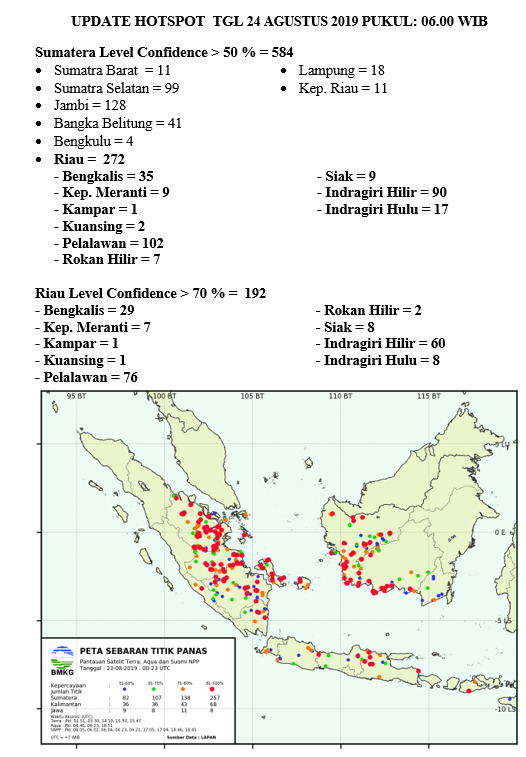 Berdasarkan data dari Badan Meteorologi, Klimatologi dan Geofisika (BMKG) Stasiun Pekanbaru, Hotspot di Kabupaten Pelalawan, Update tanggal 24 Agustus 2019 pukul 07.00 Wib Confidence >50% = 102 titik.