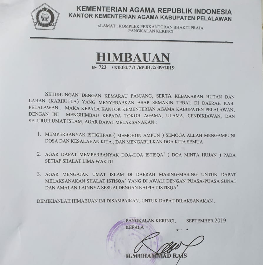 PANGKALANKERINCI (MR) - Kantor Kementerian Agama (Kemenag) Kabupaten Pelalawan mengajak Tokoh Agama, Ulama, Cendikiawan dan seluruh umat Islam agar dapat memperbanyak Istighfar (Doa memohon ampun), memperbanyak doa-doa Istisqa' (Doa minta hujan) setiap shalat lima waktu serta dapat mengajak umat Islam didaerah masing-masing untuk dapat melaksanakan shalat istisqa' yang dawali dengan puasa-puasa sunat dan amalan lainnya sesuai dengan kaifiat istisqa'.