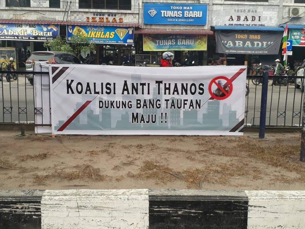 "Koalisi anti Thanos dukung bang Taufan Maju, " begitu tulisan spaduk yang terpasang di simpang empat lampu merah jalan Sudirman Dumai.