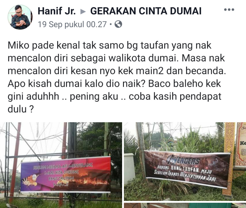 Postingannya yang berbunyi "Miko pade kenal tak samo bg taufan yang nak mencalon diri sebagai walikota dumai. Masa nak mencalon diri kesan nyo kek main2 dan becanda. Apo kisah dumai kalo dio naik? Baco baleho kek gini aduhhh .. pening aku .. coba kasih pendapat dulu ?." mendadak viral dan mendapat lebih dari 135 komentar.