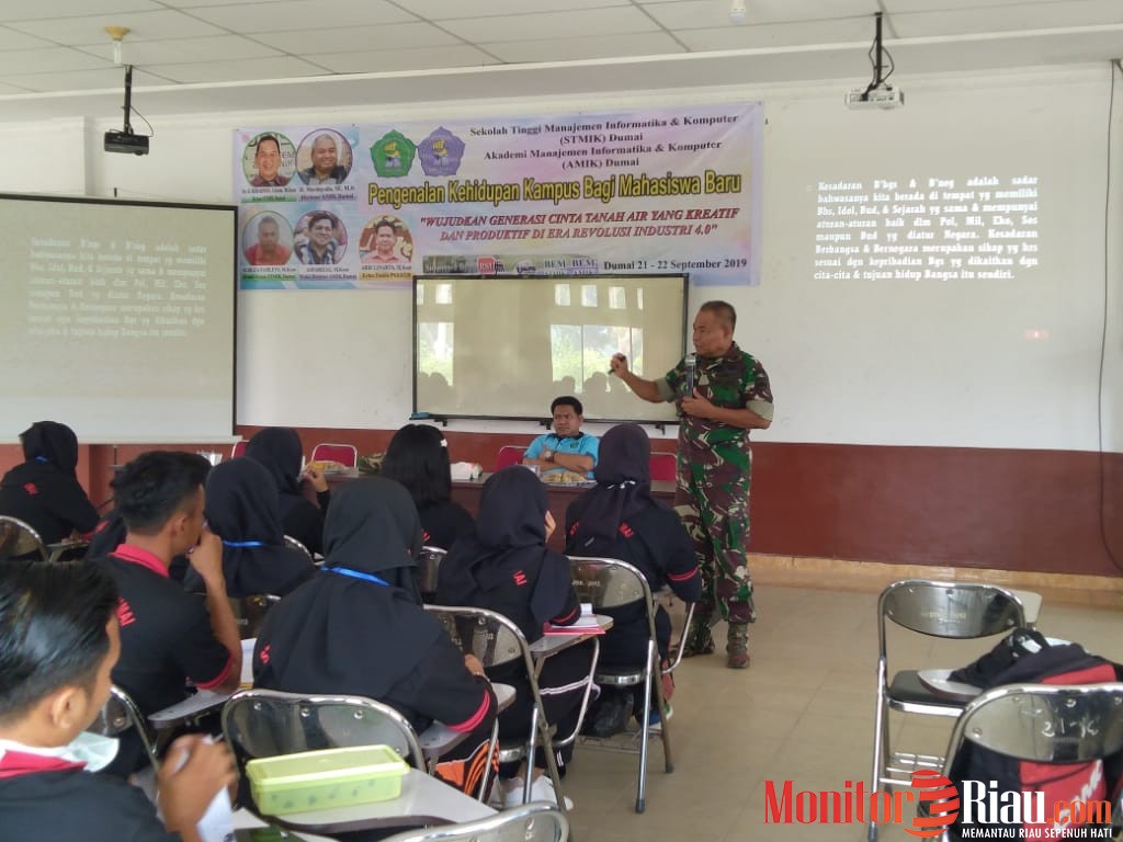 DUMAI (MR) - Kodim 0320/Dumai memberikan meteri ARTI KEHIDUPAN BERBANGSA dan BERNEGARA pada kegiatan Pengenalan Kehidupan Kampus Bagi Mahasiswa Baru (PKKMB) di STMIK-AMIK, Minggu (22/09/2019).