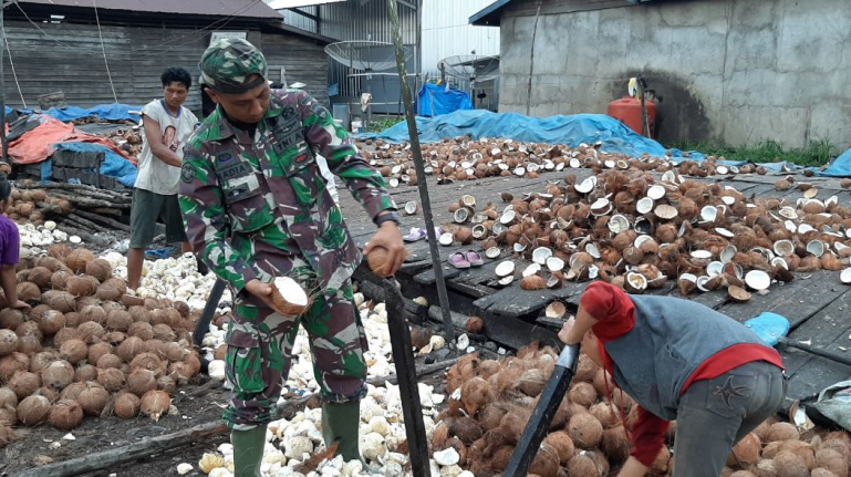 Tidak hanya ia, Anggota yang ikut bersama Danki ini pun berbaur dengan masyarakat untuk Komsos bersama masyarakat yang ikut membantu mencongkel buah kelapa yang akan di jadikan Kopra untuk di jual. Pendim