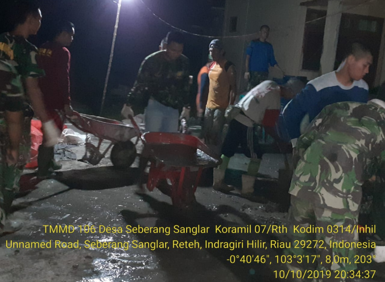 RETEH (MR) - Satuan Tugas (Satgas) TNI Manunggal Membangun Desa (TMMD) ke- 106 Kodim 0314/Inhil, terpaksa melakukan mengecoran tapak opret jembatan beton Desa Seberang Sanglar saat malam hari, Kamis (10/10/2019) malam.
