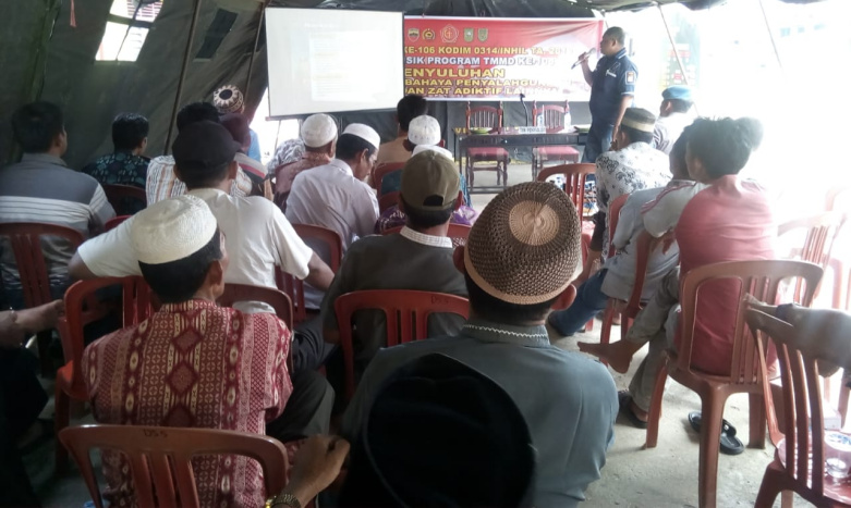 RETEH (MR) - Satuan tugas TNI Manunggal Membangun Desa (TMMD) ke-106 Kodim 0314/Inhil memberikan penyuluhan wawasan kebangsaan dan sosialiasi bahaya narkoba dan zat adiktip lainnya dikantor Desa Sanglar, Jumat (11/10/2019).