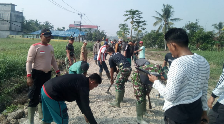 Danramil 02/Tanah merah Kapten Inf Handoko selaku pengawas di penimbunan jalan dengaan sertu semangat masyarakat sangat mengacungkan jempol kepada masyarakat yang ada di Desa sanglar tersebut.
