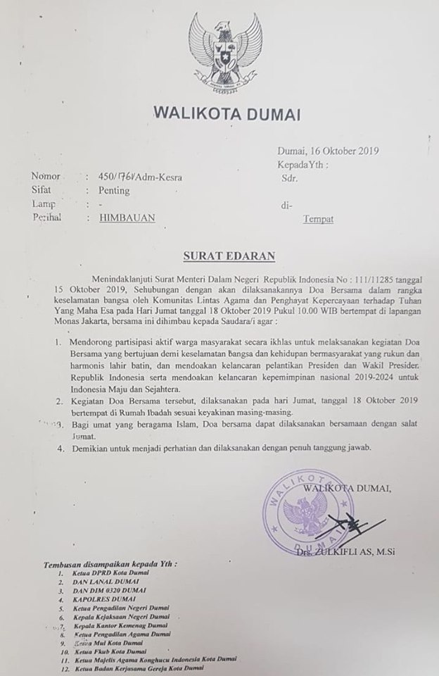 Walikota Dumai, Drs Zulkifli AS menghimbau agar Mendorong partisipasi aktif warga masyarakat secara ikhlas untuk melaksanakan kegiatan Doa Bersama yang bertujuan demi keselamatan Bangsa dan kehidupan bermasyarakat yang rukun dan harmonis lahir batin, dan mendoakan kelancaran pelantikan Presiden dan Wakil Presiden Republik Indonesia serta mendoakan kelancaran kepemimpinan nasional 2019-2024 untuk Indonesia Maju dan Sejahtera.