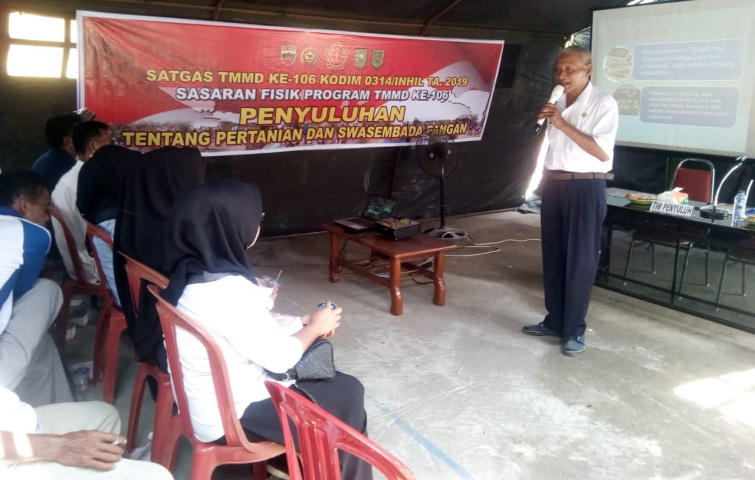 RETEH (MR) - Satuan Tugas TNI Manunggal Masuk Desa (TMMD) ke-106 Kodim 0314/Inhil menggelar kegiatan non fisik berupa penyuluhan pertanian dan perkebunan kepada masyarakat di Desa Sanglar dan Desa Seberang Sanglar, Kecamatan Reteh, Rabu (23/10/2019).