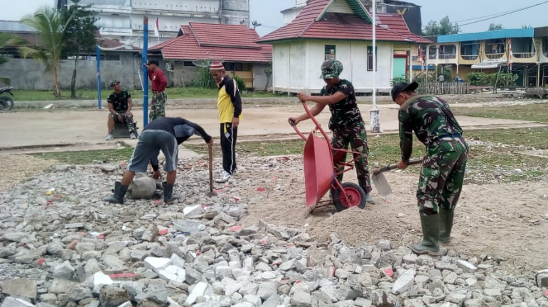 RETEH (MR) - Satgas Tentara Manunggal Membangun Desa (TMMD) ke 106 Kodim 0314/Inhil selain melakukan pengerjaan sasaran yang telah terencana, juga melakukan kegiatan tambahan di luar sasaran fisik sebagai wujut karya bhakti di Desa Sanglar yaitu peninbunan lapangan Desa Sanglar dengan sirtu, Jumat (25/10/2019).