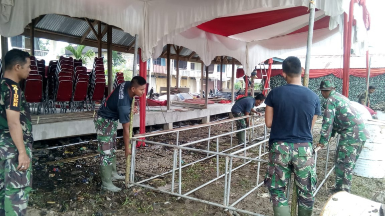 Mulai dari pemasangan kain untuk menghiasi lapangan menyeting tempat panggung,pemasangan jaring samaran untuk memperindah lapangan serta mendirikan tenda-tenda untuk tempat tamu dan undangan pun telah dilakukan.