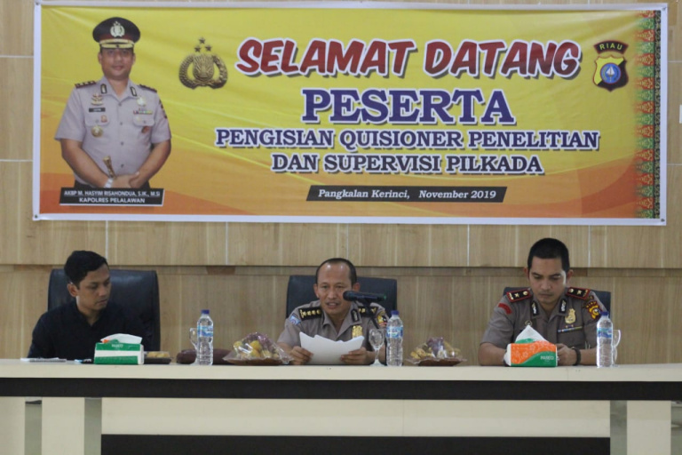 PELALAWAN (MR) - Tim Puslitbang Polri adakan penelitian tentang Dampak Positif dan Negatif terkait Pelaksanaan Pilkada Langsung dalam Rangka Kesiapan Pengamananan Pemilukada Tahun 2020, Selasa (12/11/2019).
