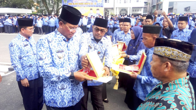BAGANSIAPIAPI(MR) - Bupati Rohil H. Suyatno AMp bertindak sebagai inspektur upacara memperingati Hari Ulang Tahun (HUT) Korps Pegawai Republik Indonesia (Korpri) ke-48 di depan kantor BPKAD Rohil jalan Merdeka Bagansiapiapi,Jumat (29/11/2019).