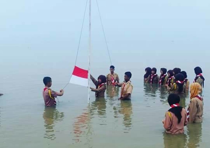 Saat itu meski “berbasah-kuyup”, puluhan anggota pramuka dengan rapi melakukan baris-berbaris dan menaikkan bendera, layaknya upacara pada umumnya.