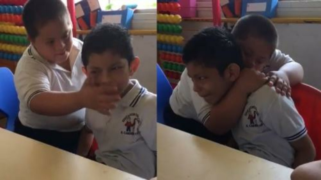 Rekaman ini diabadikan oleh seorang guru salah satu sekolah di Meksiko, Amerika Utara. Bocah laki-laki down syndrome itu meletakkan tangan dan membelai rambut temannya yang sedang kesusahan. Ia bahkan ikut menyeka air mata temannya yang menangis.