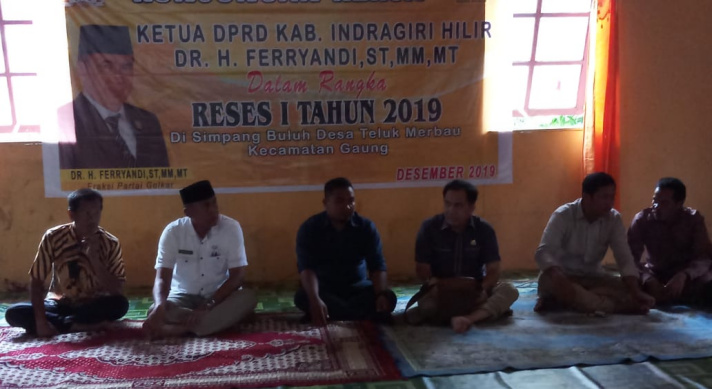 TEMBILAHAN (MR) - Ketua DPRD Kabupaten Indragiri Hilir (Inhil) periode 2019-2024, DR H Ferryandi yang melaksanakan kegiatan Reses I Tahun 2019 di Desa Teluk Merbau, Kecamatan Gaung disambut antusias warga setempat, Rabu (11/12/2019)