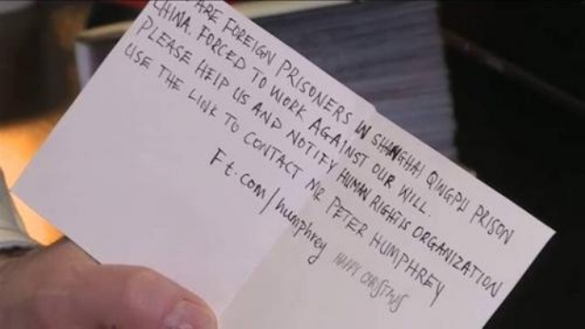 "Kami adalah tahanan asing di Penjara Shanghai Qingpu, China," isi pesan itu, dalam kartu bergambar seekor anak kucing dengan topi Santa.