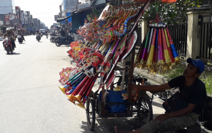 TEMBILAHAN (MR) - Sedikitnya 150 buah Terompet dipasarkan di Tembilahan, Kabupaten Indragiri Hilir (Inhil). Nartam, pria kelahiran 69 itu malah mengaku lesu.