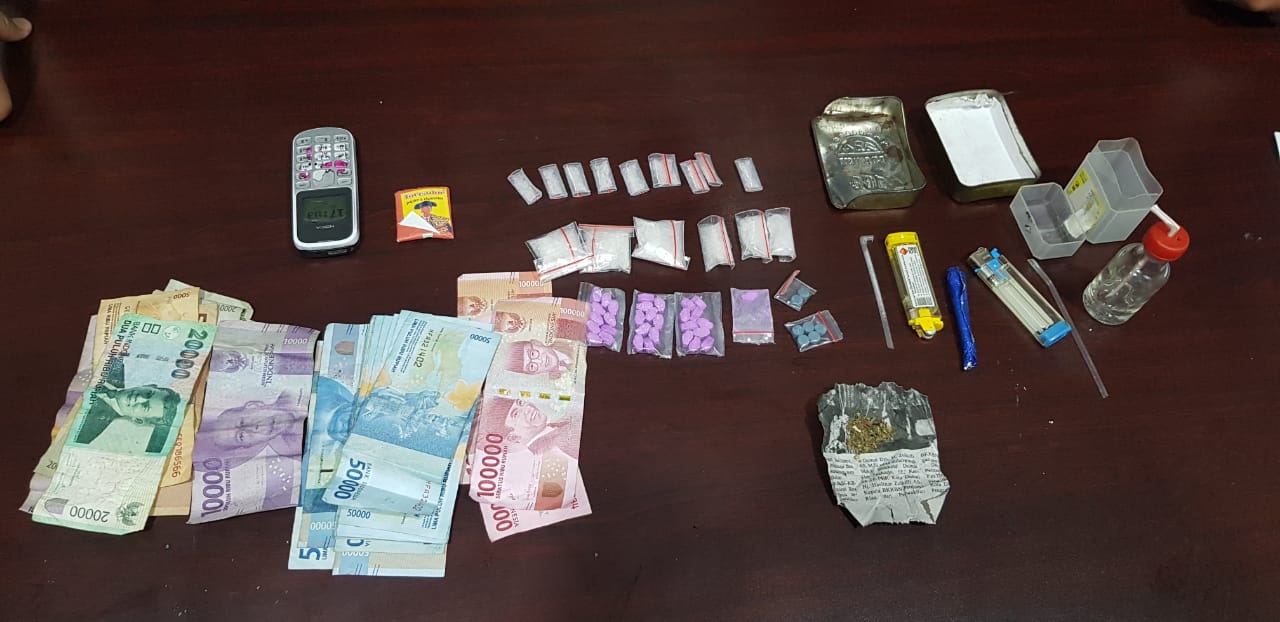 "Dari pelaku JM ini kita amankan Barang Bukti diantranya1 plastik warna hitam yang berisikan 1 kaleng Rokok Merk Dji Sam Soe yang didalamnya terdapat Narkotika jenis sabu 9 Bungkus plastik kecil,1 bungkus plastik bening kecil yang berisikan 5 Butir pil diduga narkotika jenis extacy,2 butir pil diduga narkotika jenis extacy 1kotak plastik warna putih yang didalamnya terdapat 3 bungkus plastik bening besar berisikan diduga narkotika jenis shabu,lalu 3 bungkus plastik bening sedang berisikan narkotika jenis shabu 4 bungkus plastik bening berisikan pil Extacy sebanyak 31 Butir,1bungkus kertas papor,1 bungkus kertas koran kecil berisikan narkotika jenis ganja,Seperangkat alat hisap Shabu (Bong) yang terbuat dari botol kaca kecil beserta pipet plastik dan kaca pirex, 2 mancis,1(satu) sumbu obor,1 unit Hp Nokia dengar Nomor Sim Card 085355928898 serta Uang Rp.1.230.000 ribu.(eka).