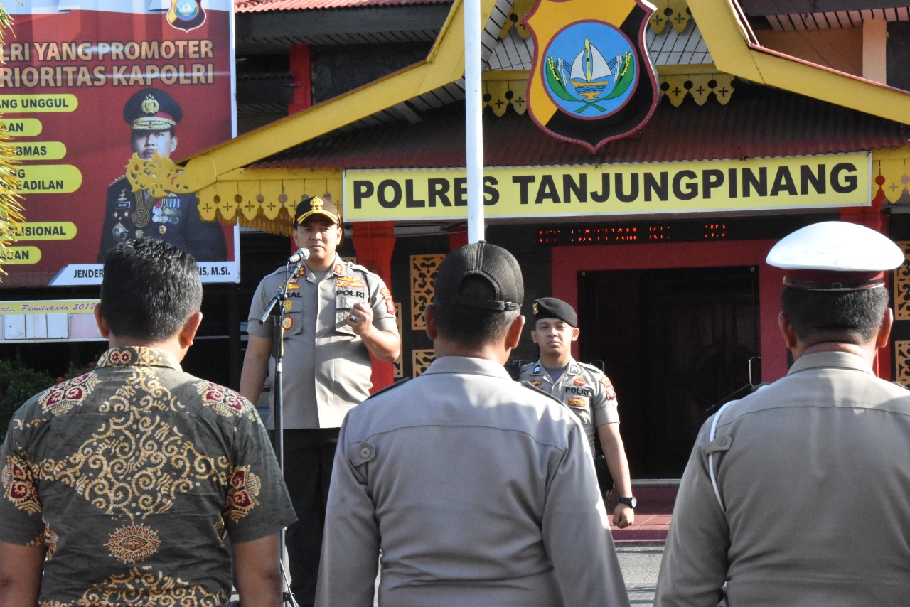 Kapolres Tanjungpinang AKBP Muhammad Iqbal, SH, SIK, M.Si memimpin pelaksanaan apel yang diikuti Pejabat Utama dan Personel Polres Tanjungpinang.