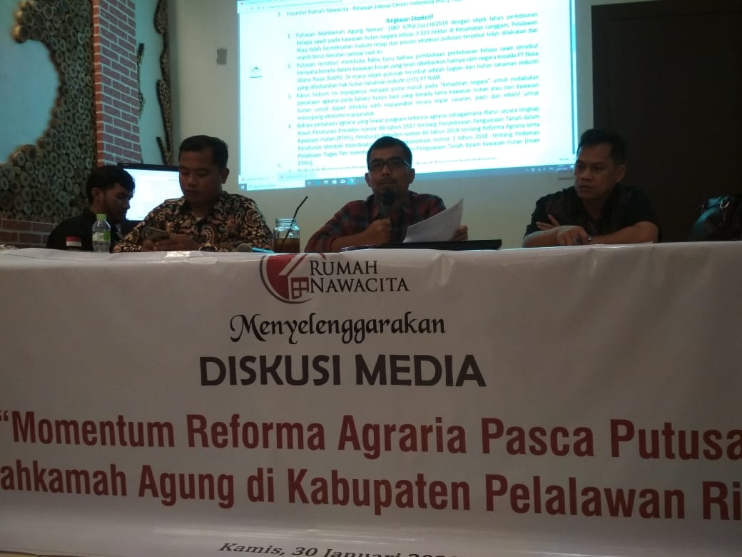 "Kita mendorong agar negara hadir dalam dinamika yang terjadi di daerah tersebut. Yakni membumikan secara konkret reforma agraria, apakah lewat skema Tanah Objek Reforma Agraria (TORA) ataupun Perhutanan Sosial (PS) pada lahan atau kawasan yang ilegal. Diskusi ini mengupas peluang itu dapat dilakukan serta aspek-aspek pidana lain yang berpotensi dikembangkan," tegas Founder Rumah Nawacita-RJCI, Raya Desmawanto, M. Si dalam kegiatan diskusi tersebut.